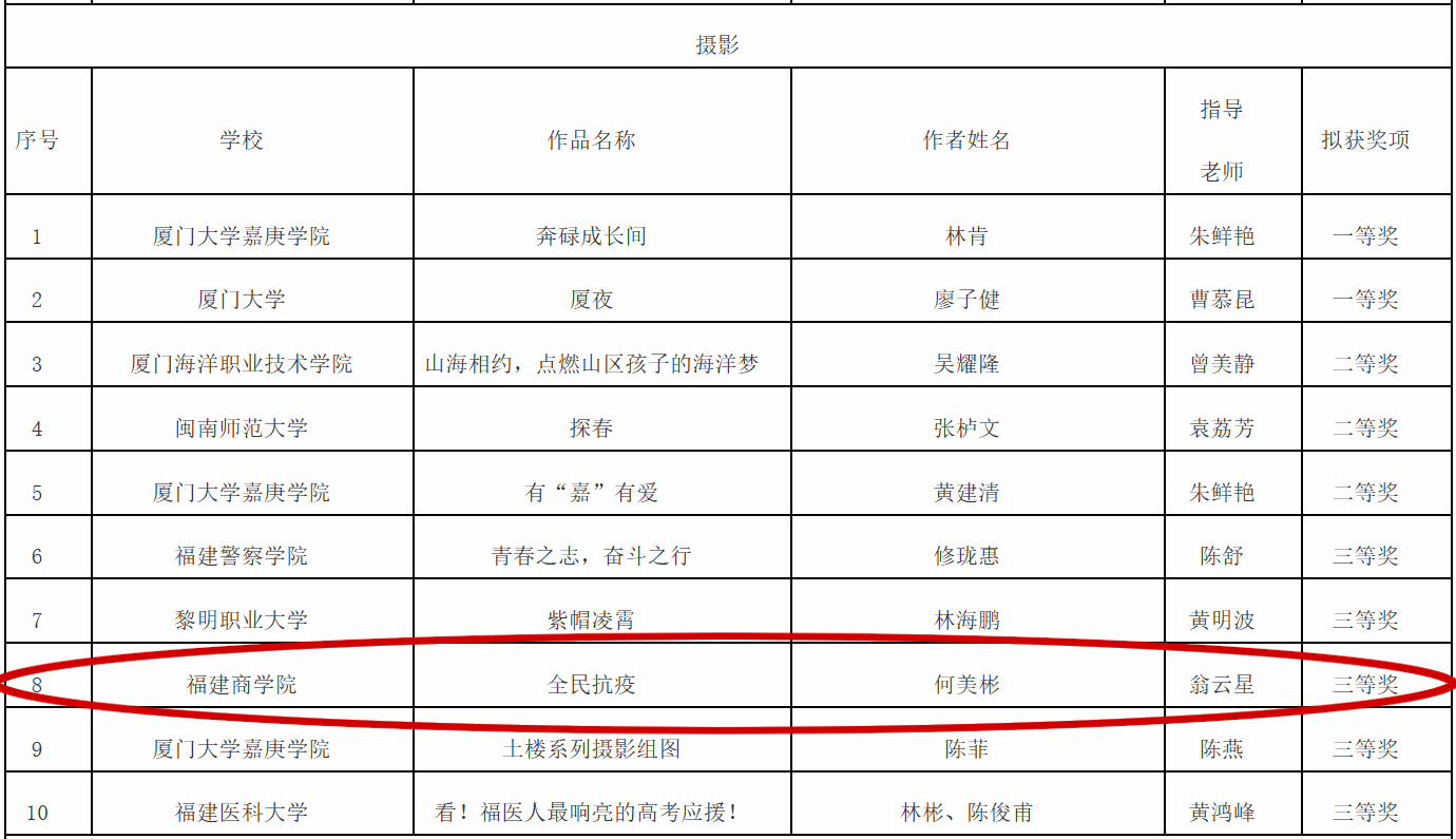 近日,由福建省委教育工委、福建省委网信办联合举办的第六届全省大学生网络文化节获奖名单揭晓。其中,米兰官网学子何美彬的作品《全民抗疫》(指导教师:翁云星)在此次比赛中荣获摄影类作品三等奖。