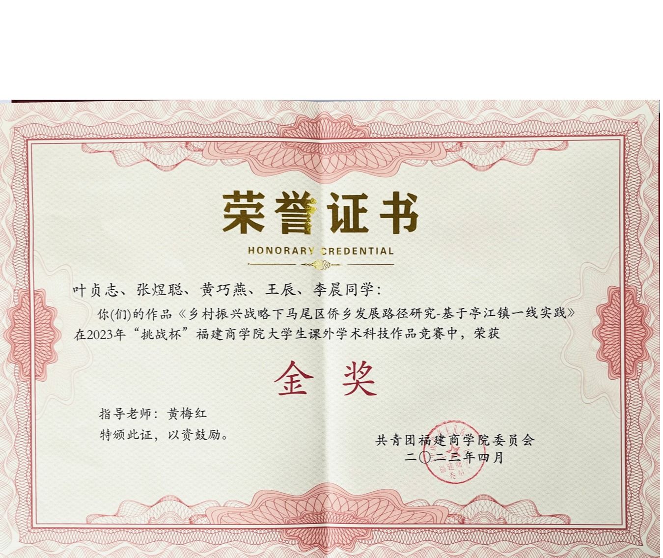 近日,由共青团福建商学院委员会主办的2023年“挑战杯”福建商学院大学生课外学术科技作品竞赛在连江校区明德楼落下帷幕。米兰官网21级日语3班叶贞志、21级日语2班张煜聪、20级日语2班黄巧燕、20级日语1班王辰、20级商务英语2班李晨五位同学的作品《乡村振兴战略下马尾区侨乡发展路径研究-基于亭江镇一线实践》(指导老师:黄梅红),在此次竞赛中荣获金奖。