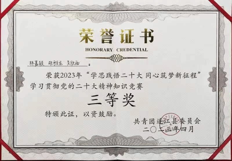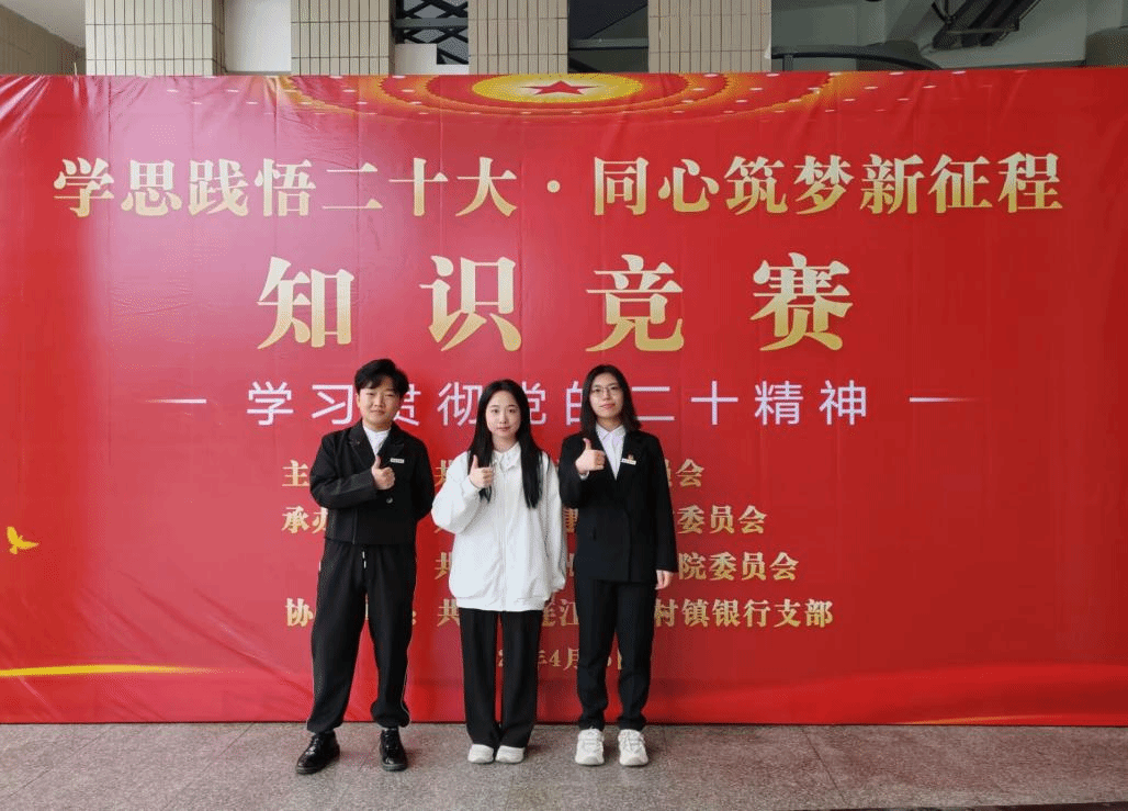 2023年4月25日,由共青团连江县委员会主办,共青团福建商学院委员会、共青团福州理工学院委员会承办,福建商学院学生协办2023年的“学思践悟二十大,同心筑梦新征程”学习贯彻党的二十大知识竞赛决赛于连江校区明德楼学生活动中心举行。由米兰milan官方网站20级商务英语3班张雅龙,21级商务英语2班林嘉颖,21级日语1班吴欣雨三位同学组成的福建商学院第一代表队在竞赛中沉着冷静、协助作答,最终荣获三等奖的好成绩。