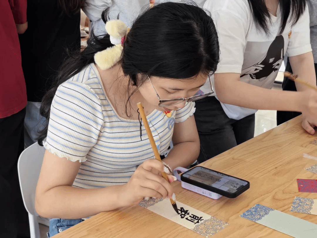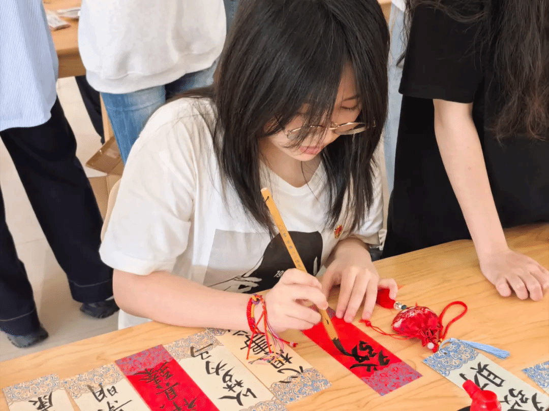 书法区则纸墨生香,同学们以笔寄情,既有"端午安康"的美好祝福,也有"长风破浪"的豪迈诗句。他们神情专注,取墨、提笔,写下的一笔一划、一撇一捺,饱含着对毕业生们的深情寄语。