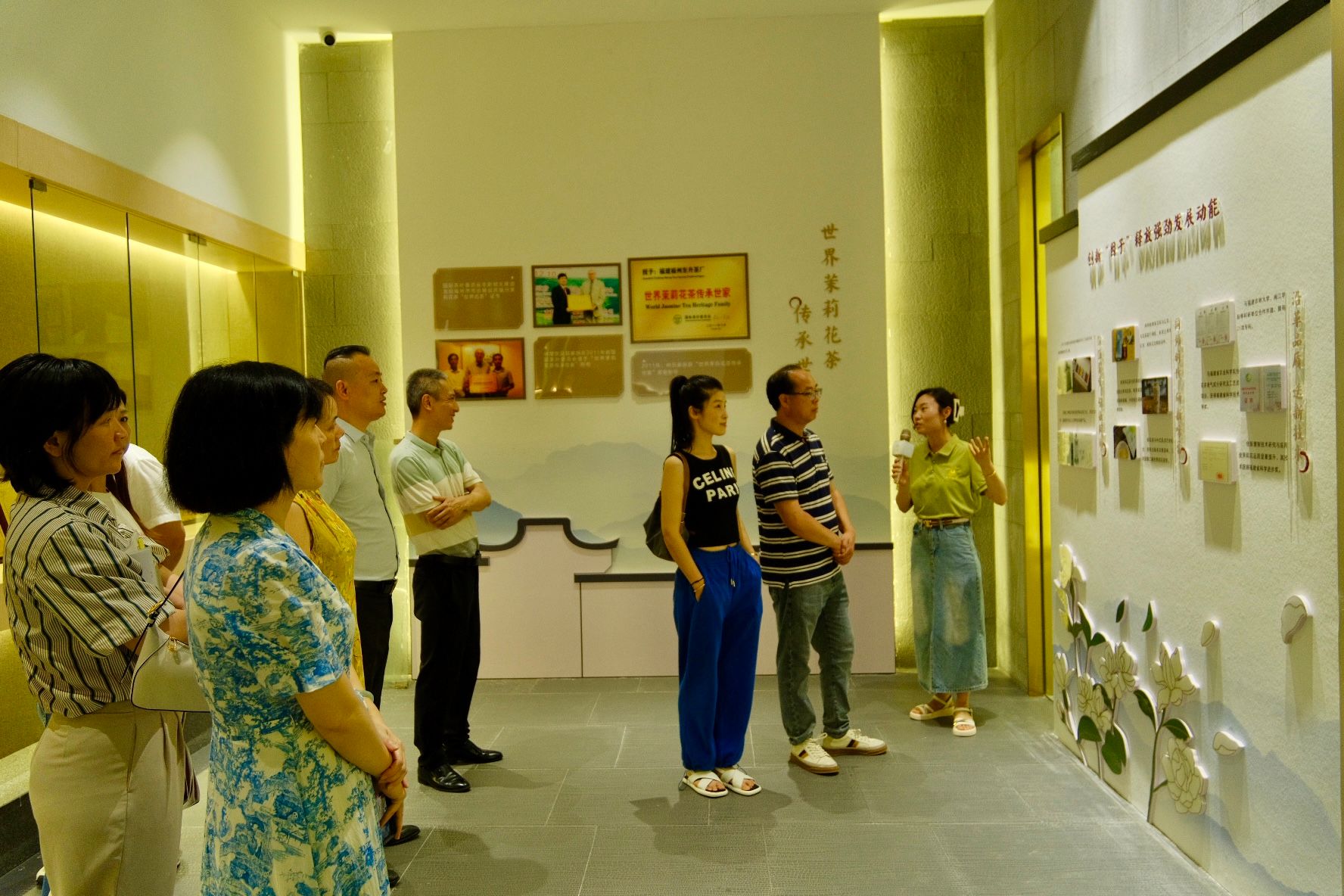 林庆文总裁带领大家参观了茉莉花茶加工坊、企业百年传承展览室等非遗传承展示区,详细介绍了福州茉莉花百年传承历史和民族茶企的艰辛历程,让人深省中华茶文化传承发扬的使命与担当。