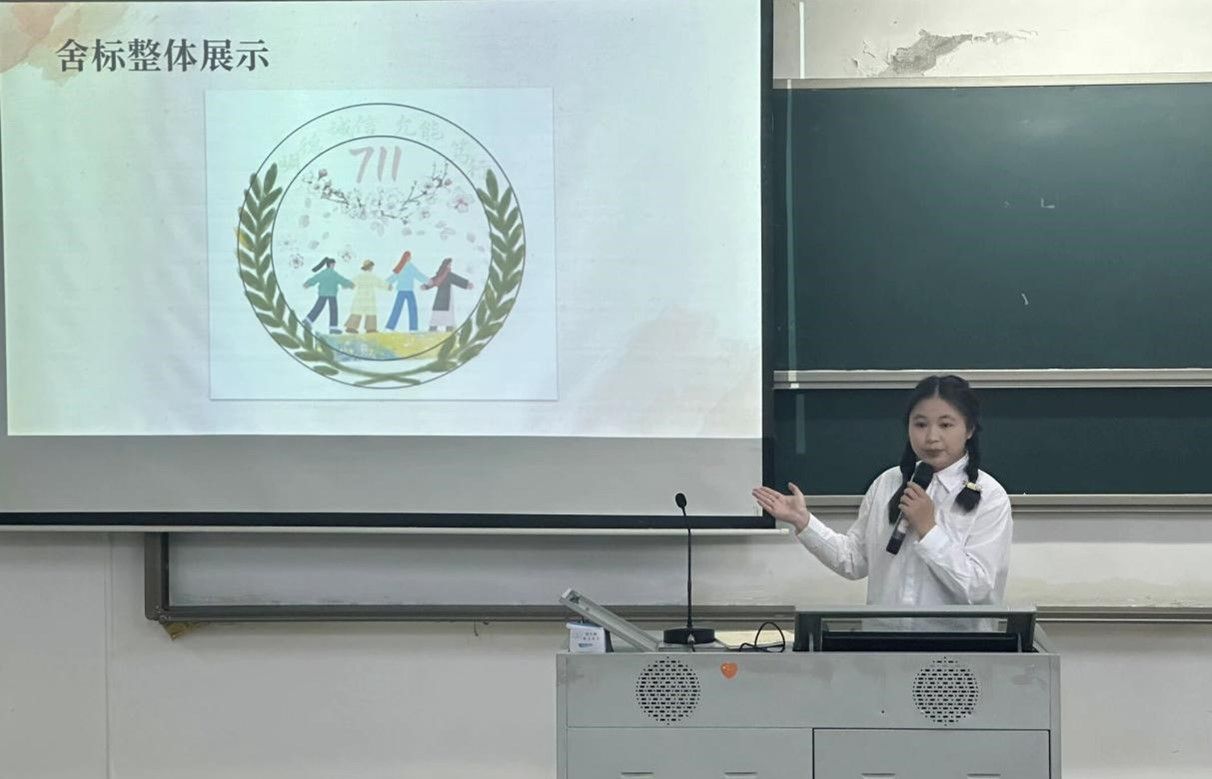 在“寓见美好,绽放舍彩”宿舍舍标大赛的赛场上,各参赛选手纷纷发挥创意,设计出富有宿舍特点的舍标,并通过生动形象的描绘,让观众们感受到了宿舍生活的温馨和美好。比如,10栋711宿舍的舍标中以四名成员为形象的卡通人物手拉手,代表着宿舍内部关系的团结与和谐。她们漫步在樱花树下,表达了走出属于自己人生繁花似锦之路的美好愿景,给在场的同学们留下深刻印象。