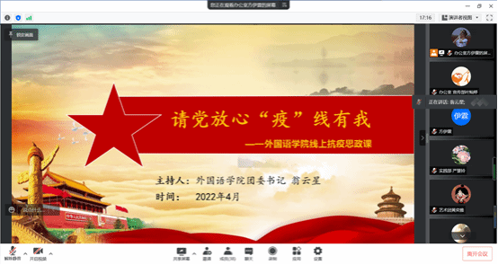 为学习贯彻落实习近平总书记关于疫情防控工作的重要指示批示精神,2022年4月7日,米兰milan官方网站于线上开展了“请党放心‘疫’线有我”抗疫思政课。本次思政课由学院团委书记翁云星老师主讲,学院全体青年学生干部参加学习。